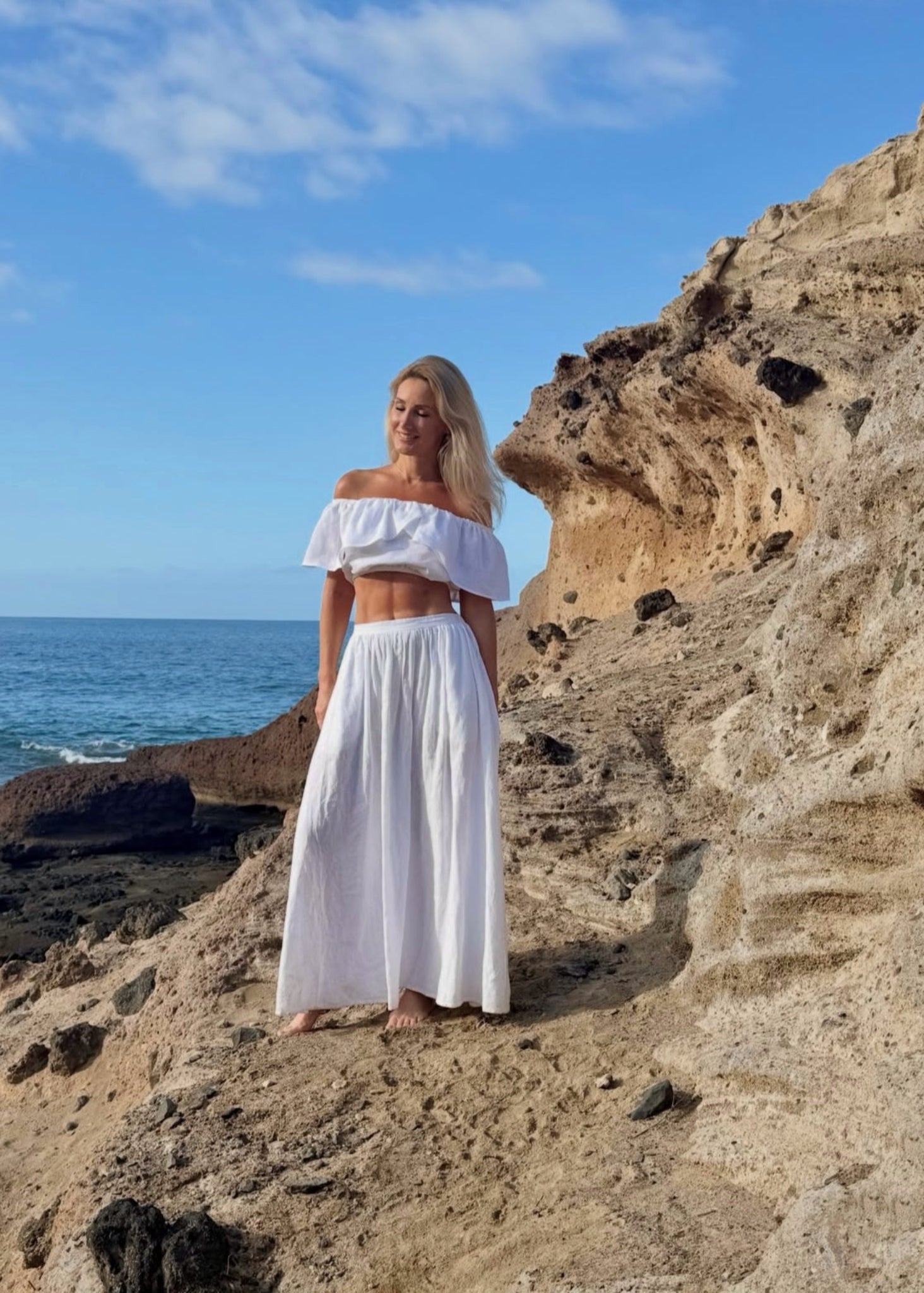 Romantic, yet clean-lined, the NOLA Crop Top brings soft drama with its off-shoulder ruffle neckline. Whether you’re wandering sunlit streets or dining by the sea, NOLA moves with you — feminine, flattering, and quietly timeless.